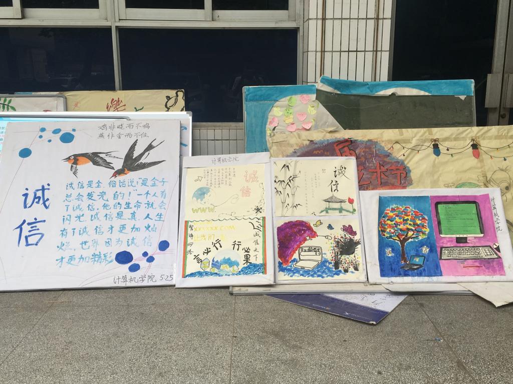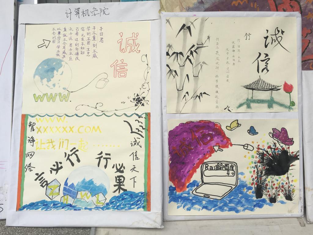 本次活动以班为单位,在自觉加强诚信建设,牢固树立诚信为本、操守为重,守信光荣、失信可耻的信用意识和道德观念等方面进行海报设计,之后选出优秀的作品进行展出。