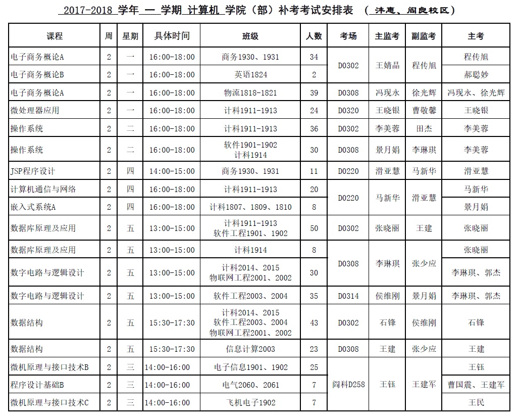 2017-2018-1学期BB贝博的官方网站课程补考安排
